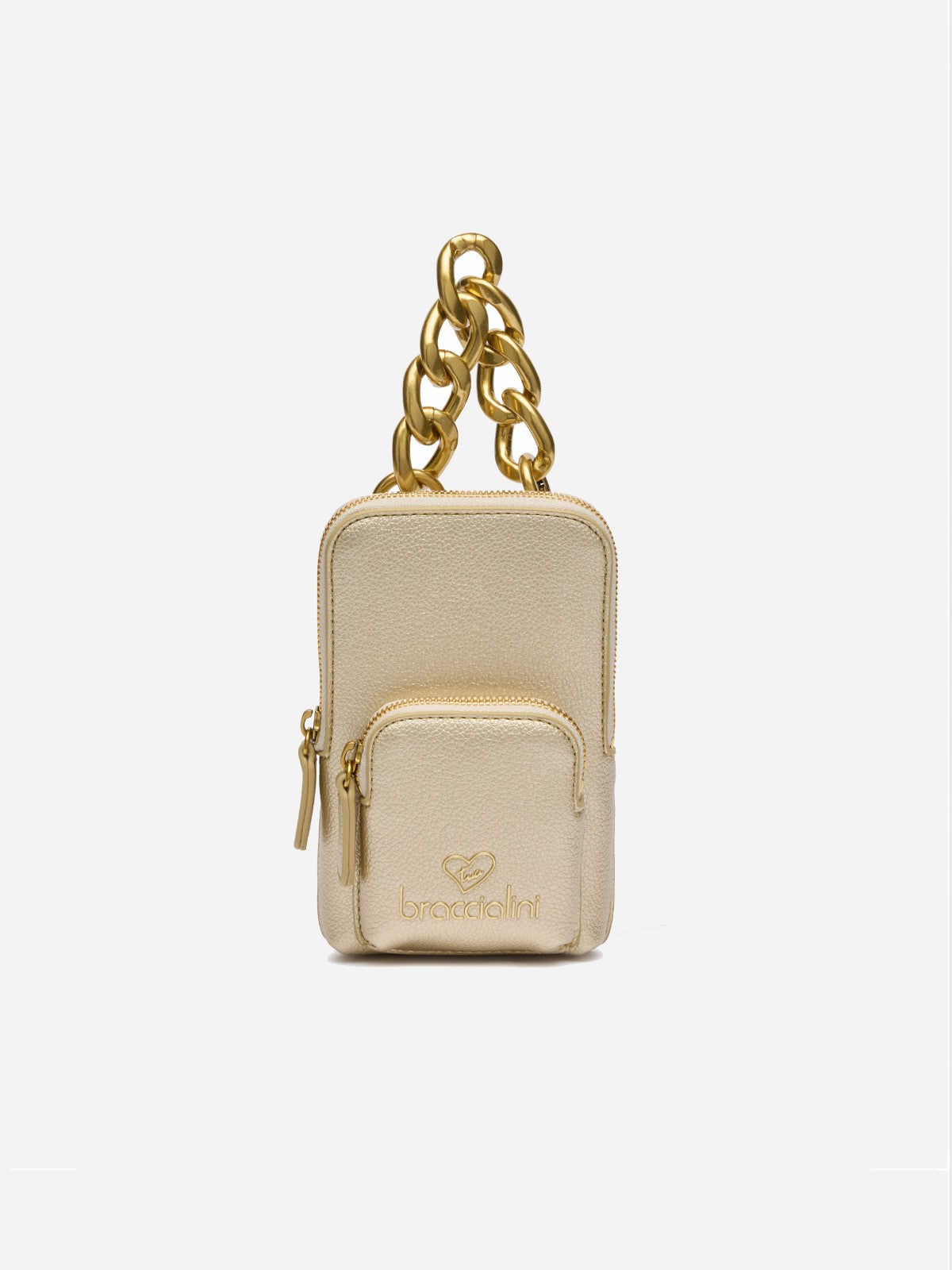 Borsa a spalla portacellulare in similpelle di colore argento, chiusura zip e una tracolla in nastro logato rimovibile. Una tasca zip frontale.