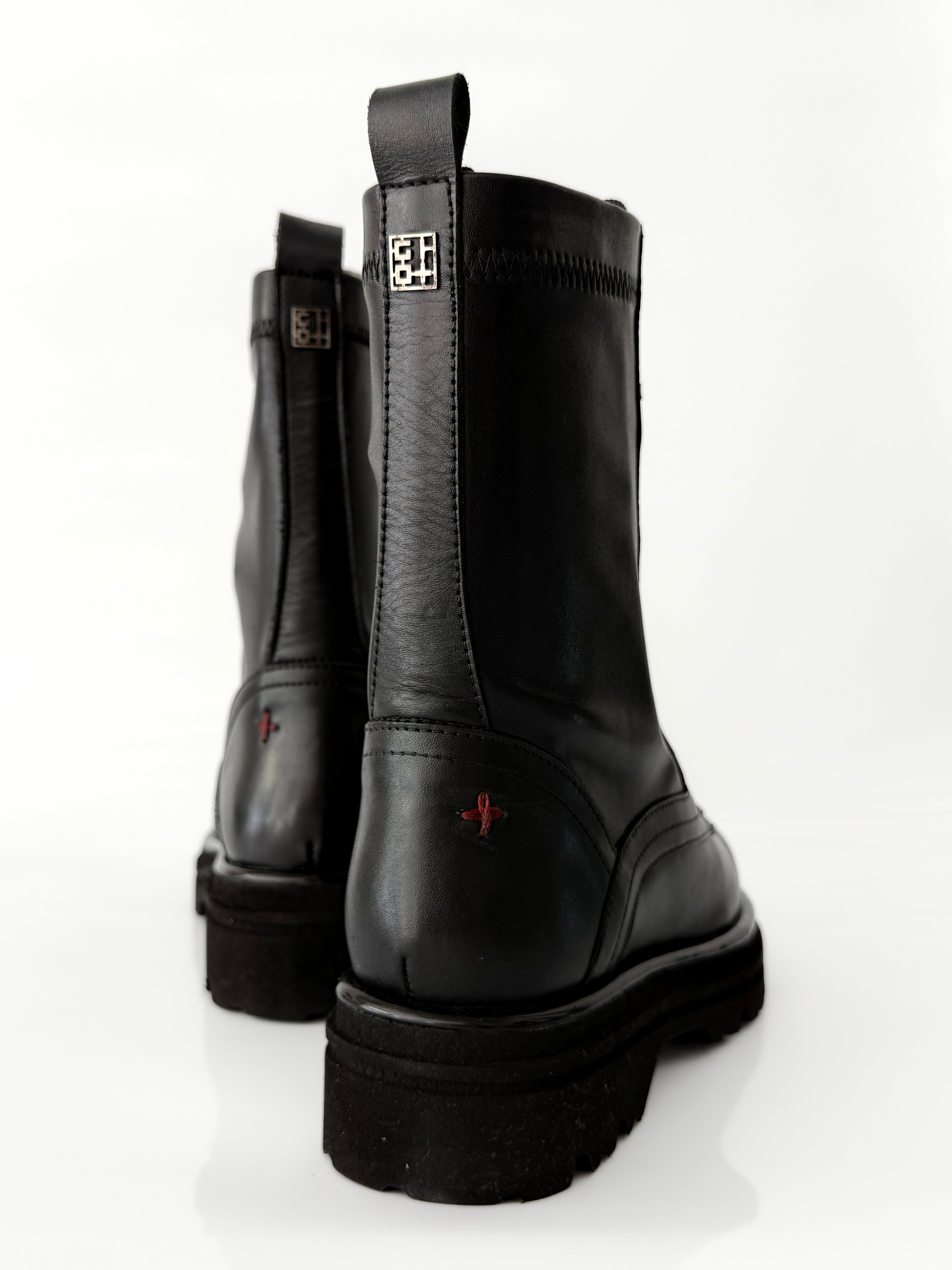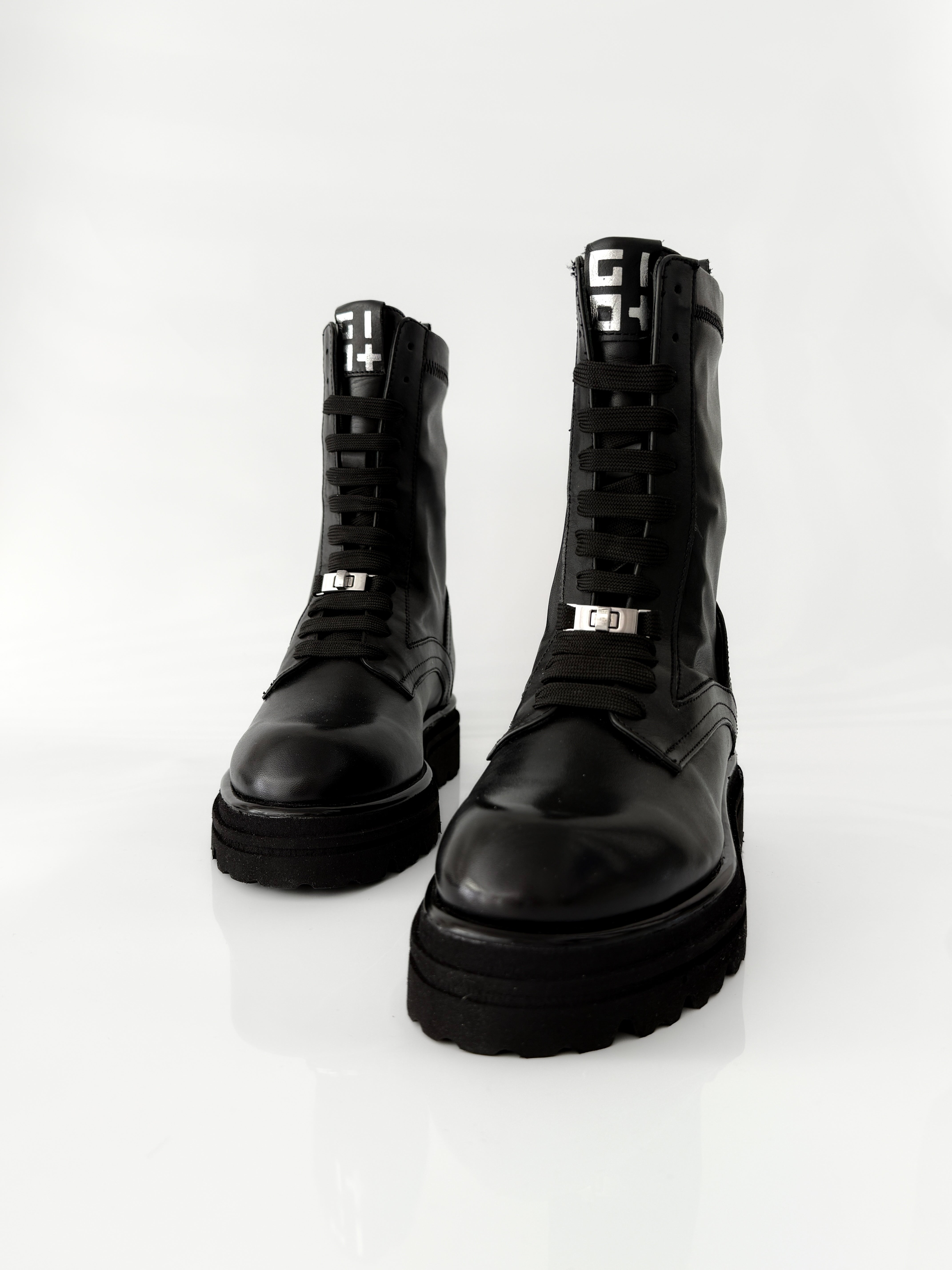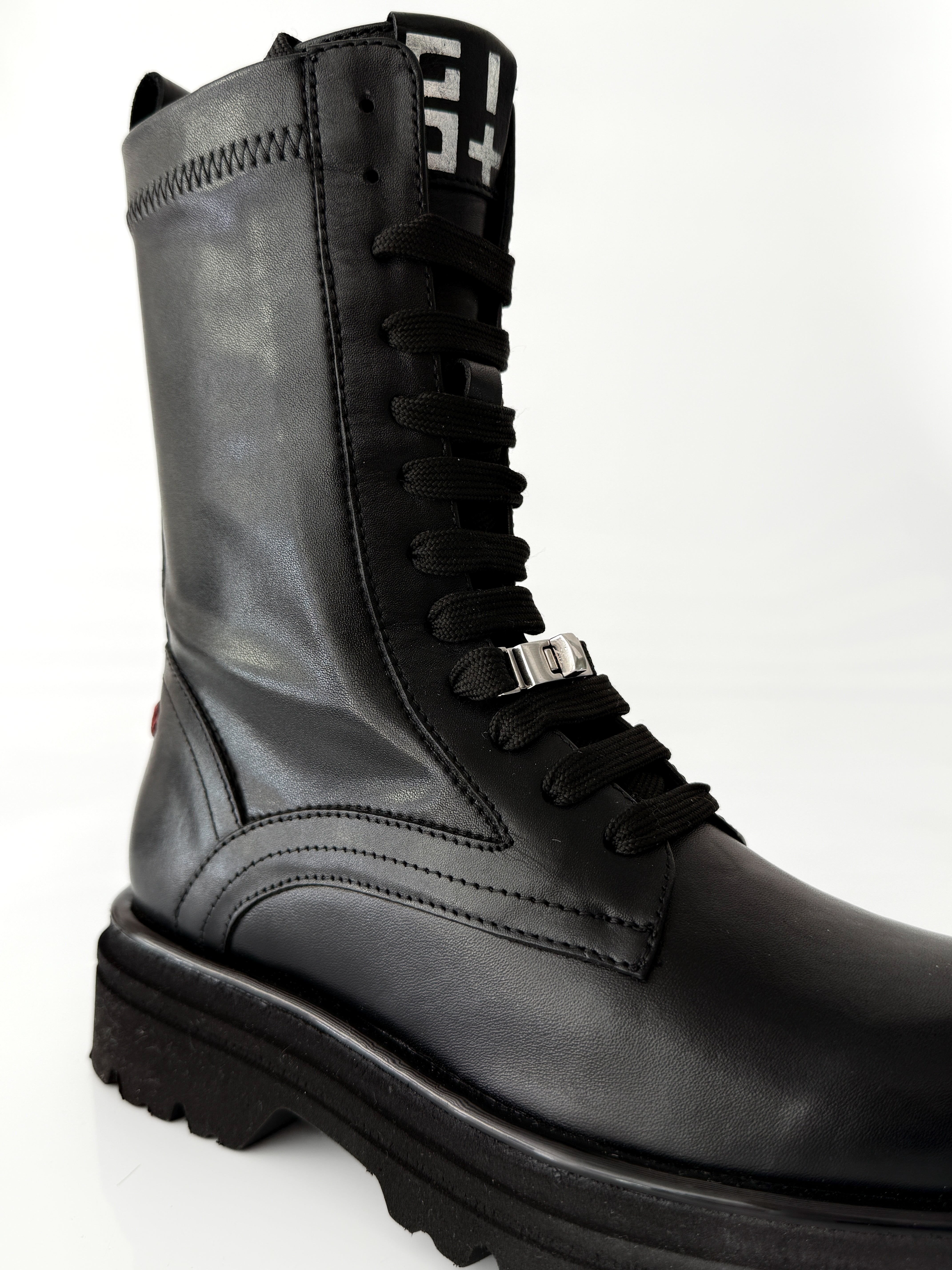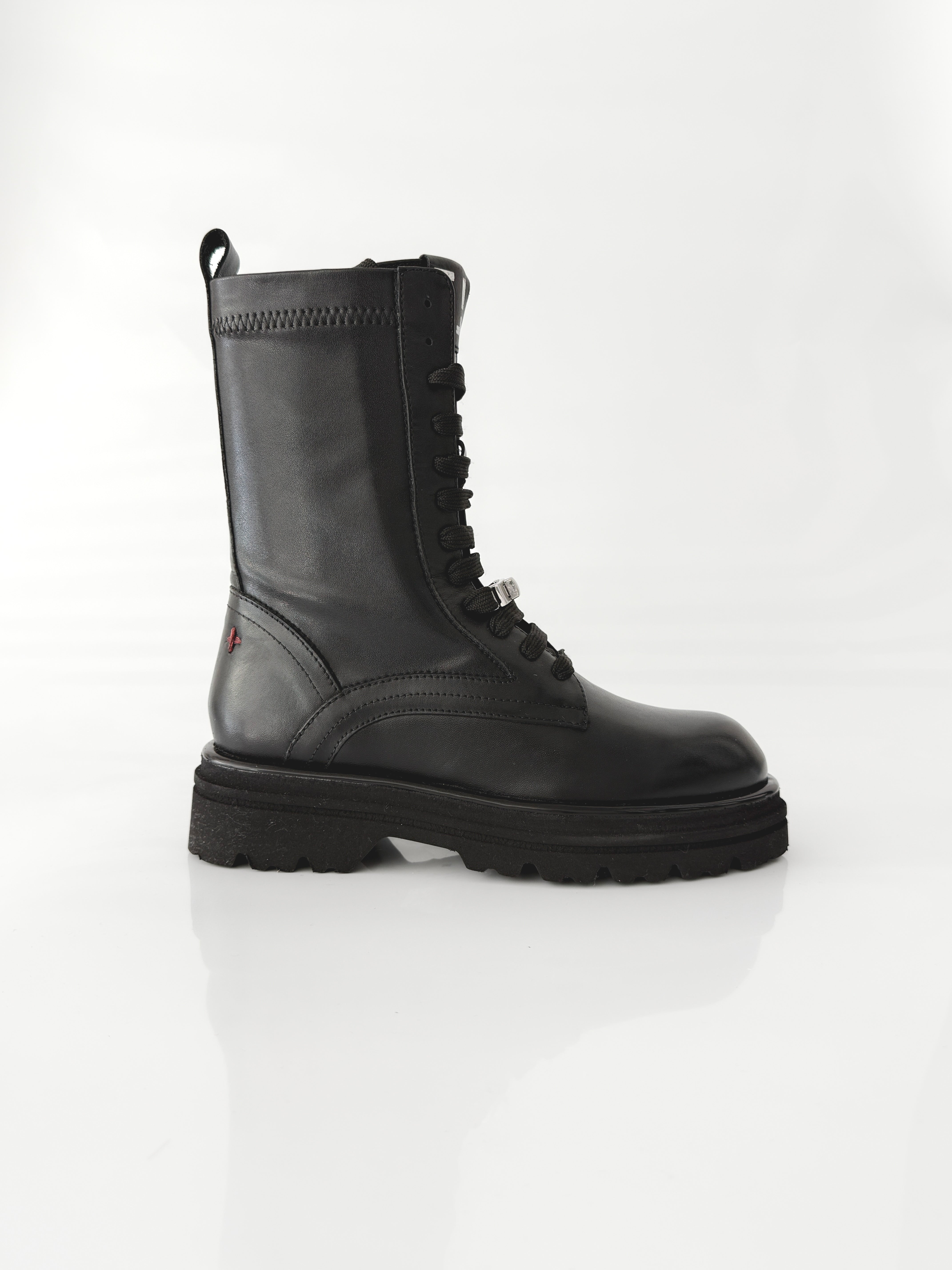 Biker boot GIO+ modello MIA in pelle di colore nero. Caratterizzato da accessori passalaccio e lacci neri. Il tessuto stretch combinato alla pelle, permette una calzata perfetta nonostante l’assenza della zip.