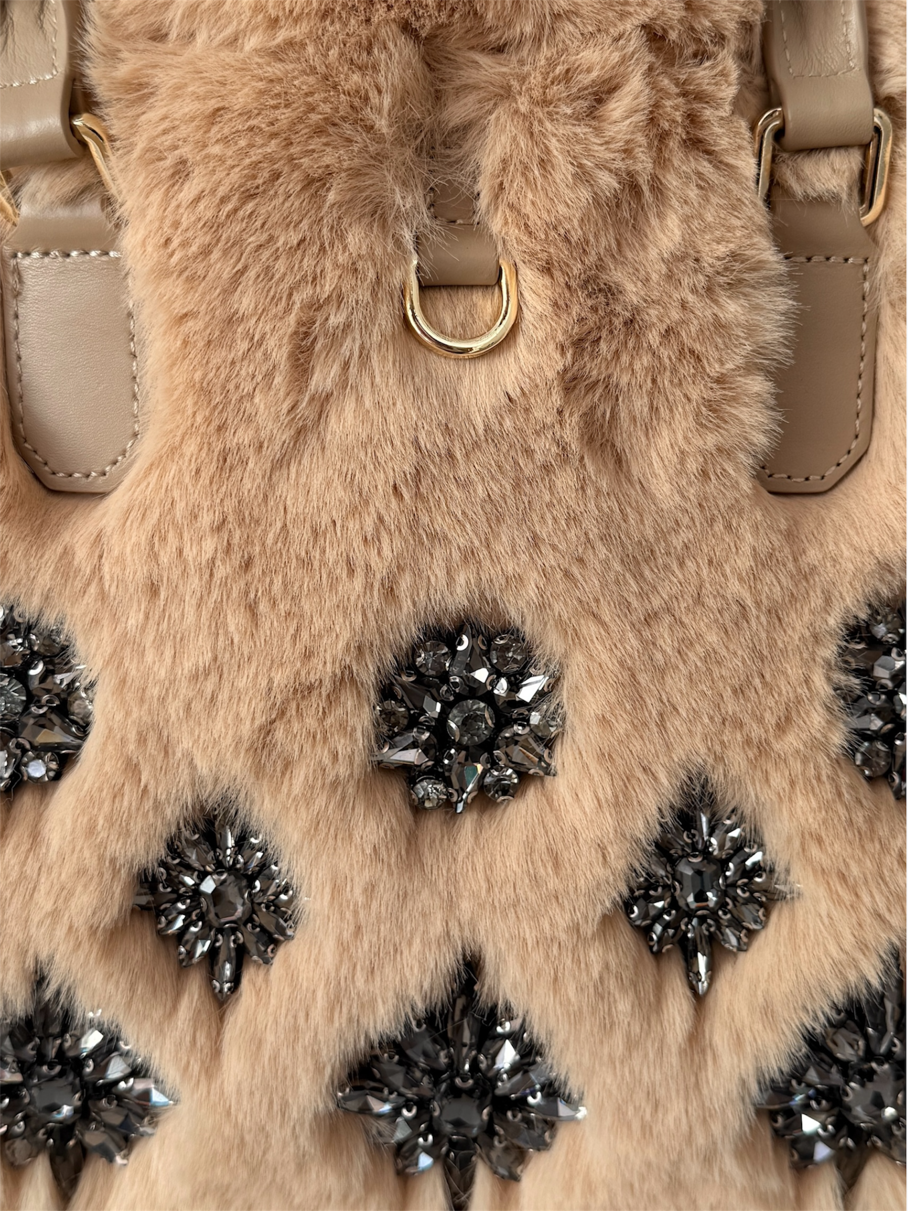 Tote bag reversibile in ecofur e vera pelle con doppi manici, doppio look. Gioielli applicati. Con maxi Pochette interna zippata e con tracolla staccabile.