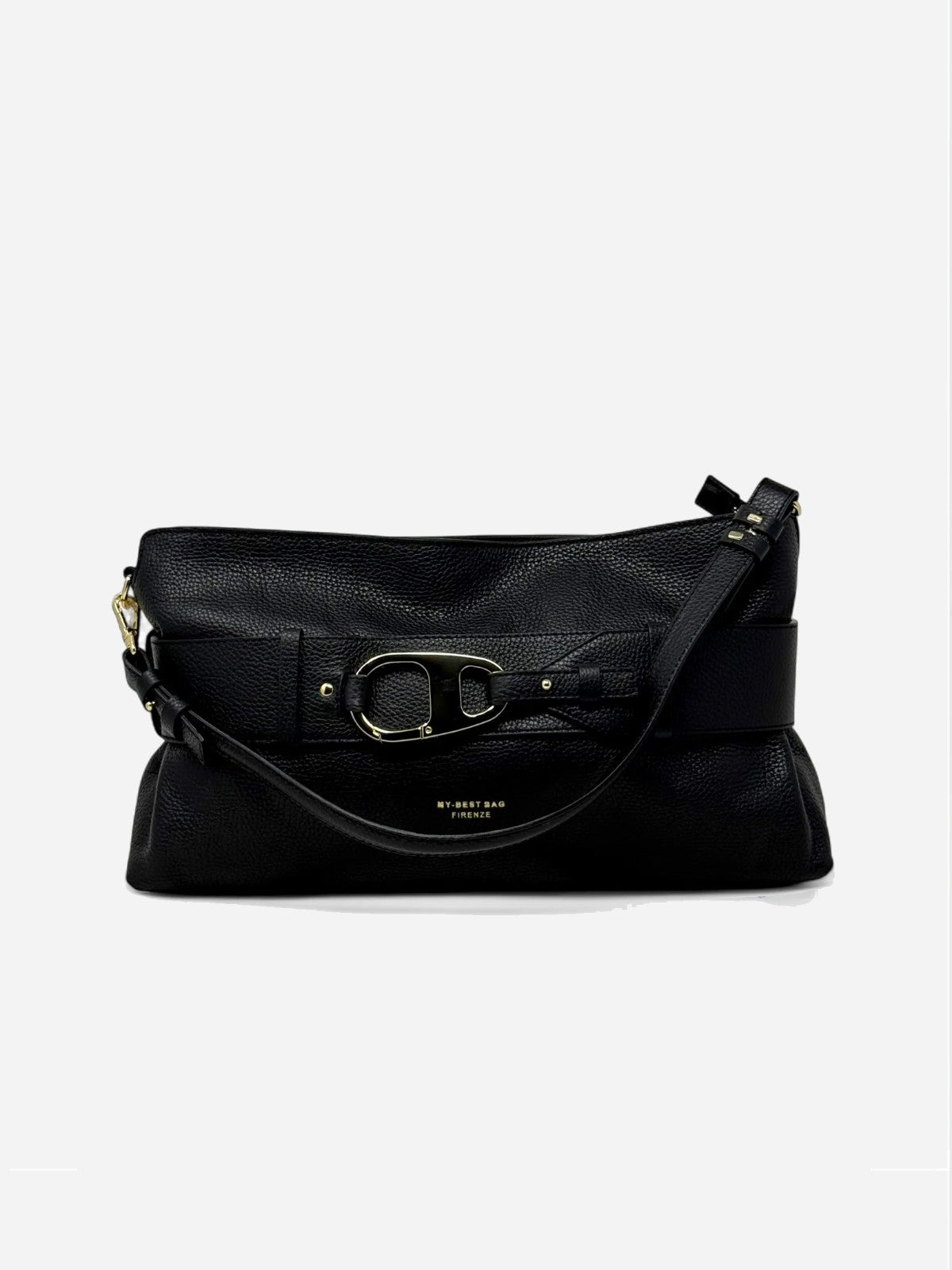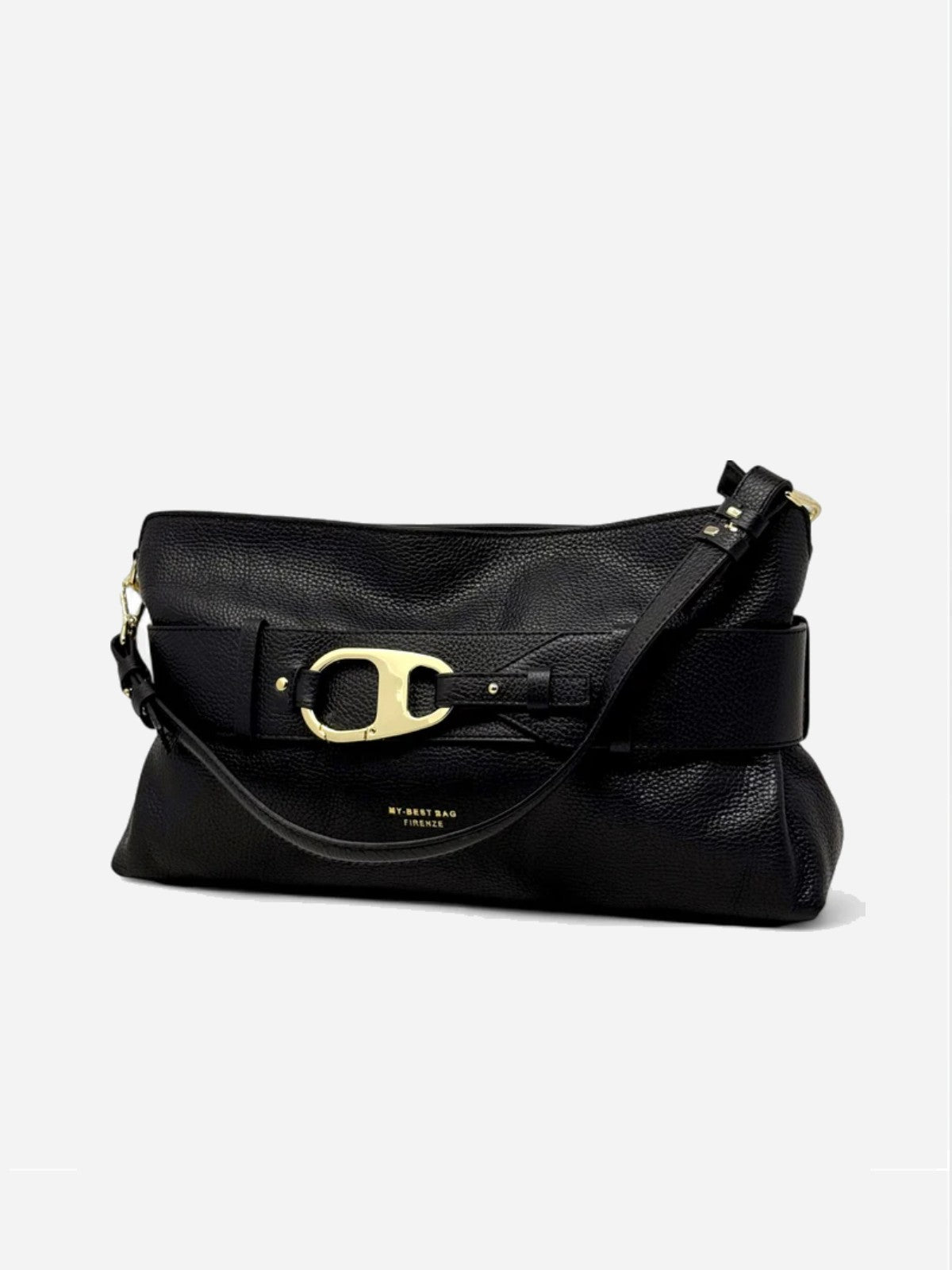 Borsa in pelle dollaro colore Nero, doppia tracolla di cui una più lunga regolabile. Fascia con passanti con moschettone oro che si trasforma in una cintuta. Chiusura con zip.