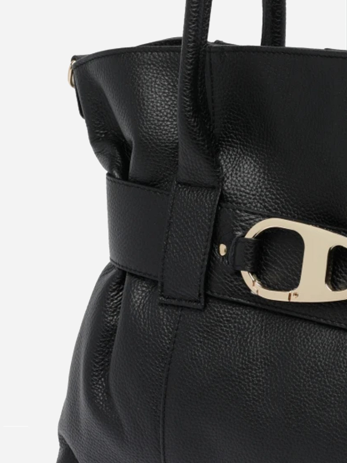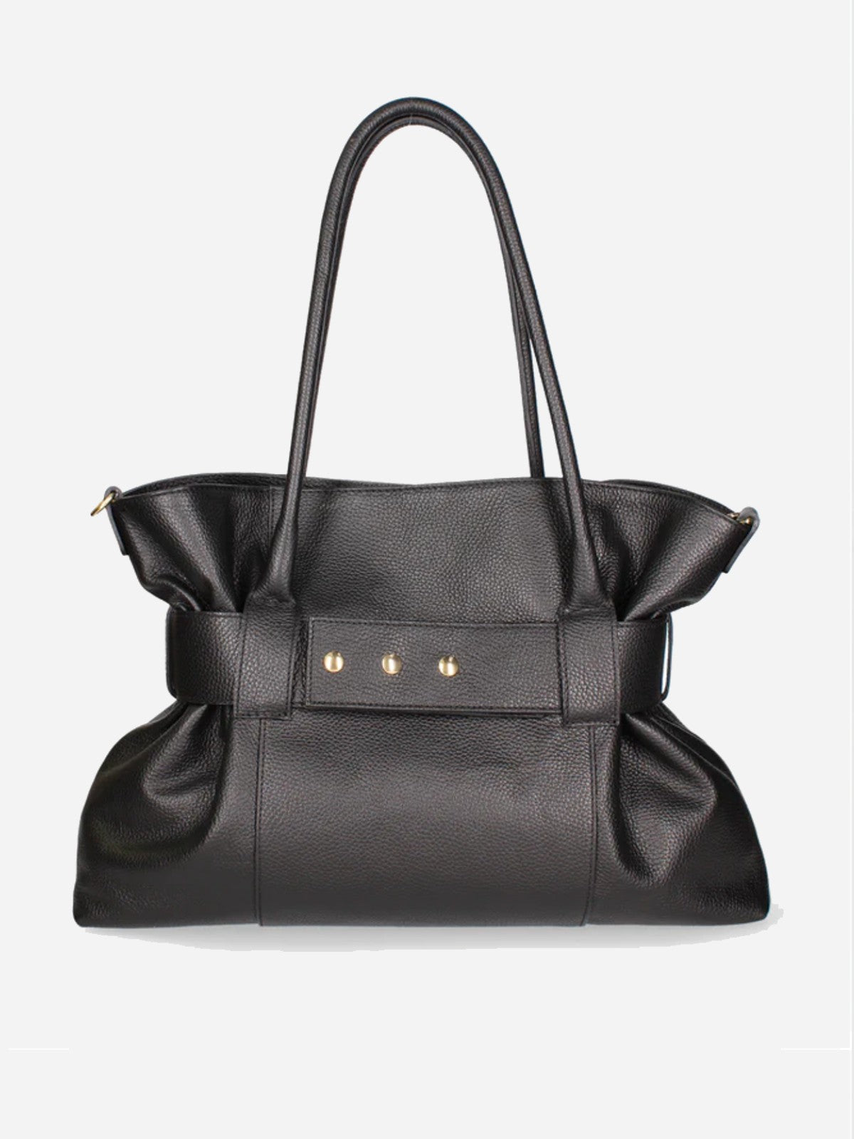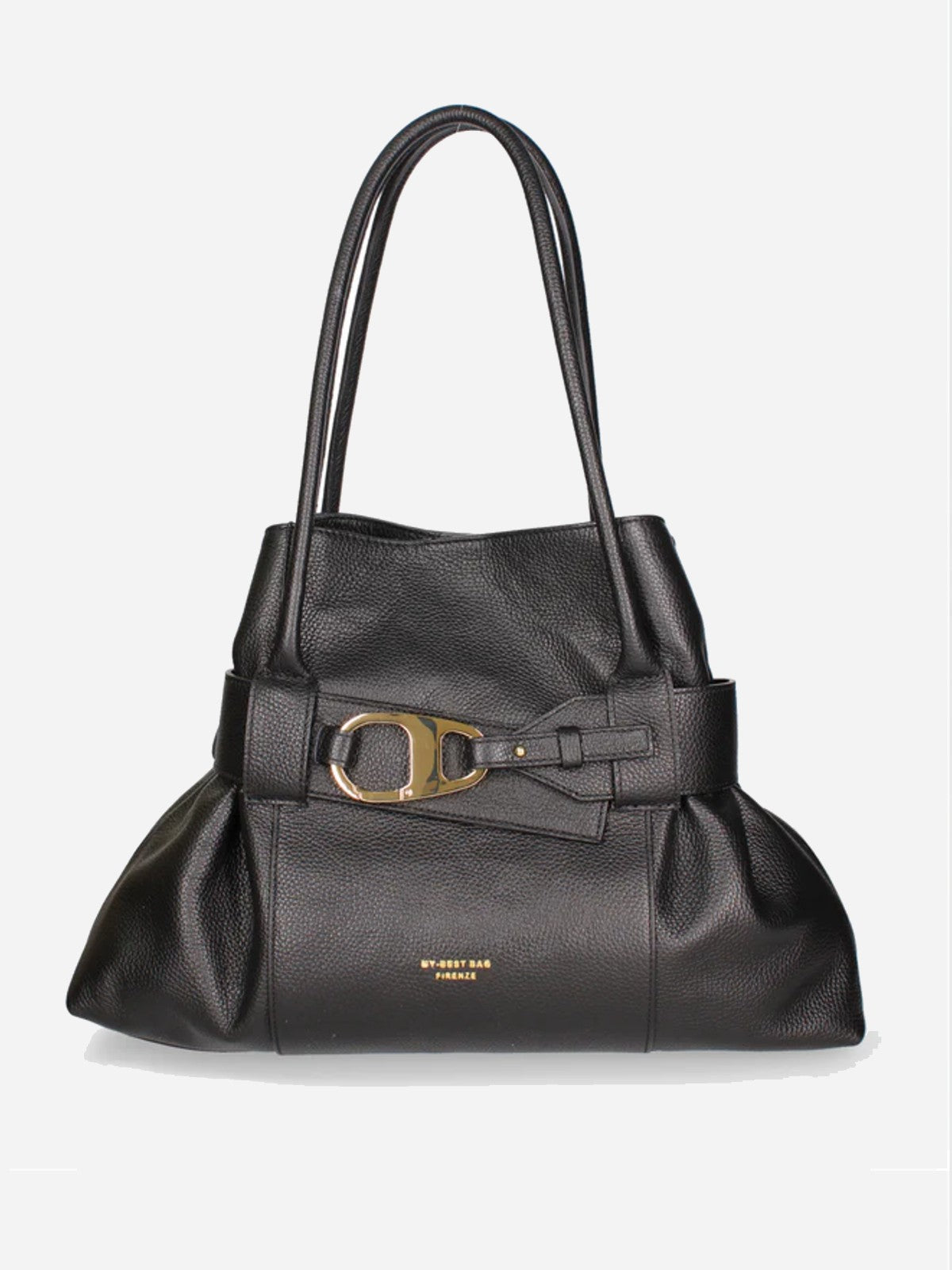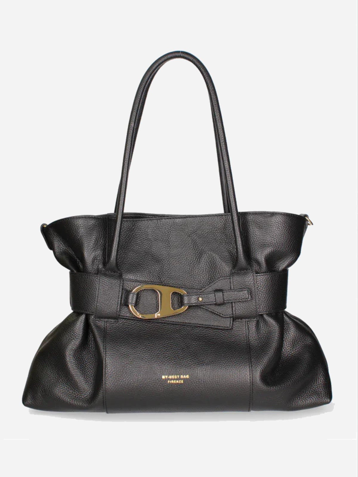 Borsa in pelle dollaro color Nero, doppia tracolla di cui una più lunga regolabile. Fascia con passanti con moschettone oro che si trasforma in una cintuta. Chiusura con zip e calamita.
