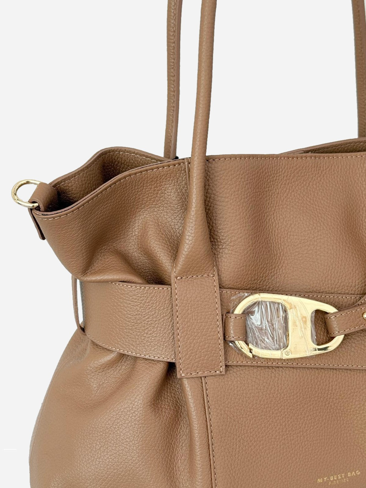 Borsa in pelle dollaro color Caramel, doppia tracolla di cui una più lunga regolabile. Fascia con passanti con moschettone oro che si trasforma in una cintura. Chiusura con zip e calamita.