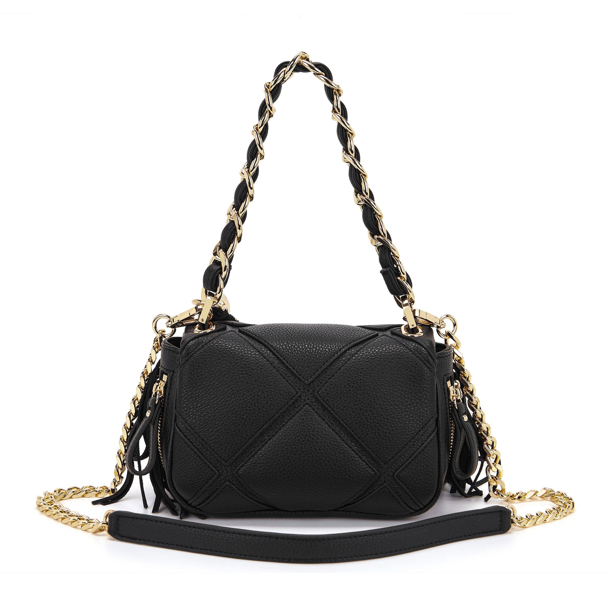 Borsa a spalla in pelle vegana con lavorazione a rombi cuciti e frange, manico in catena infilato in ecopelle e tracolla rimovibile