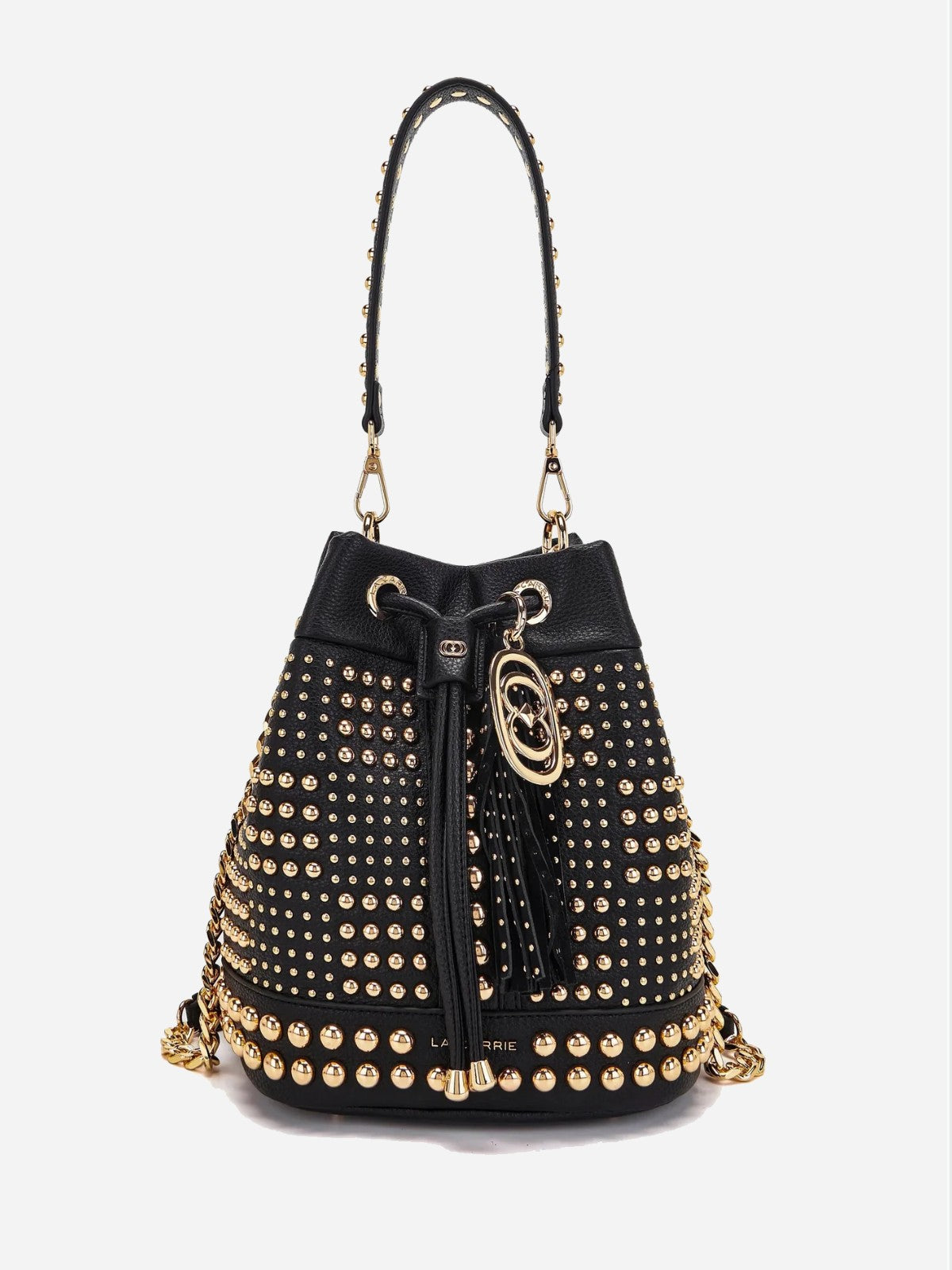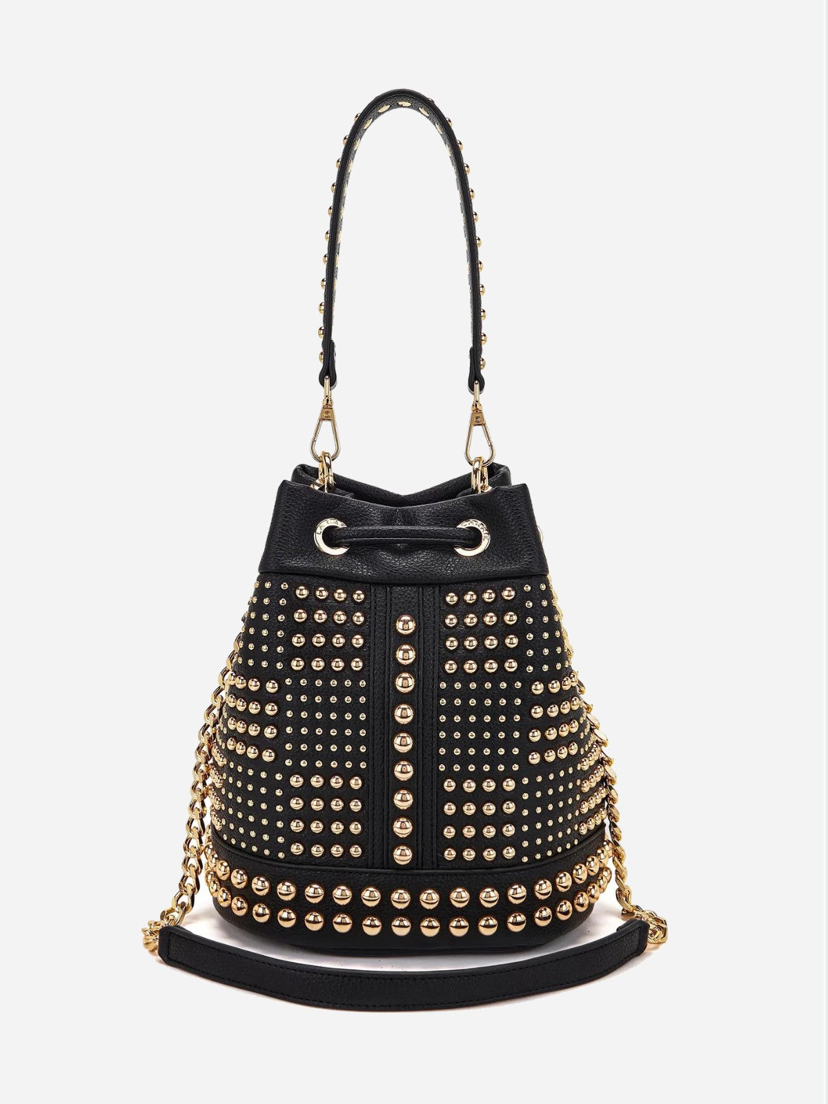 Secchiello in ecopelle effetto martellato con borchie in oro , tracolla catena e manico rimovibile