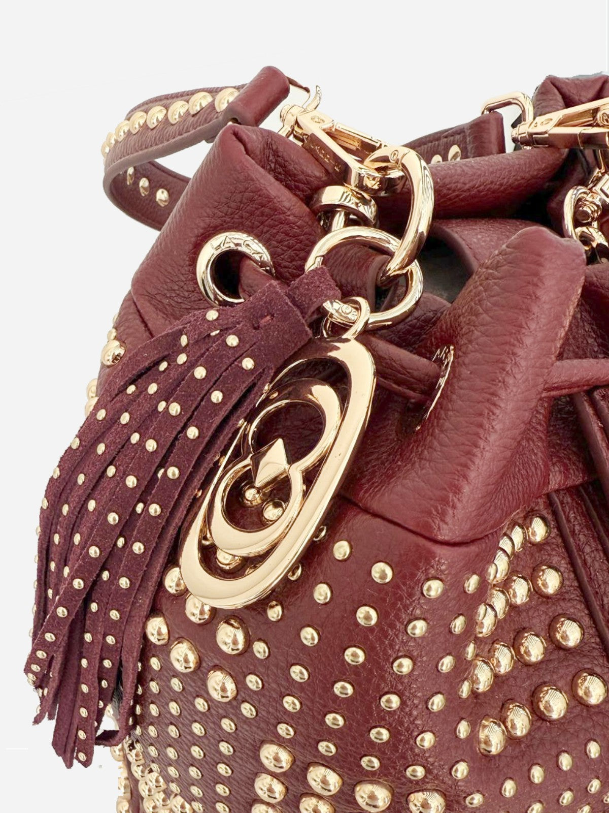 Secchiello in ecopelle effetto martellato con borchie in oro , tracolla catena e manico rimovibile.