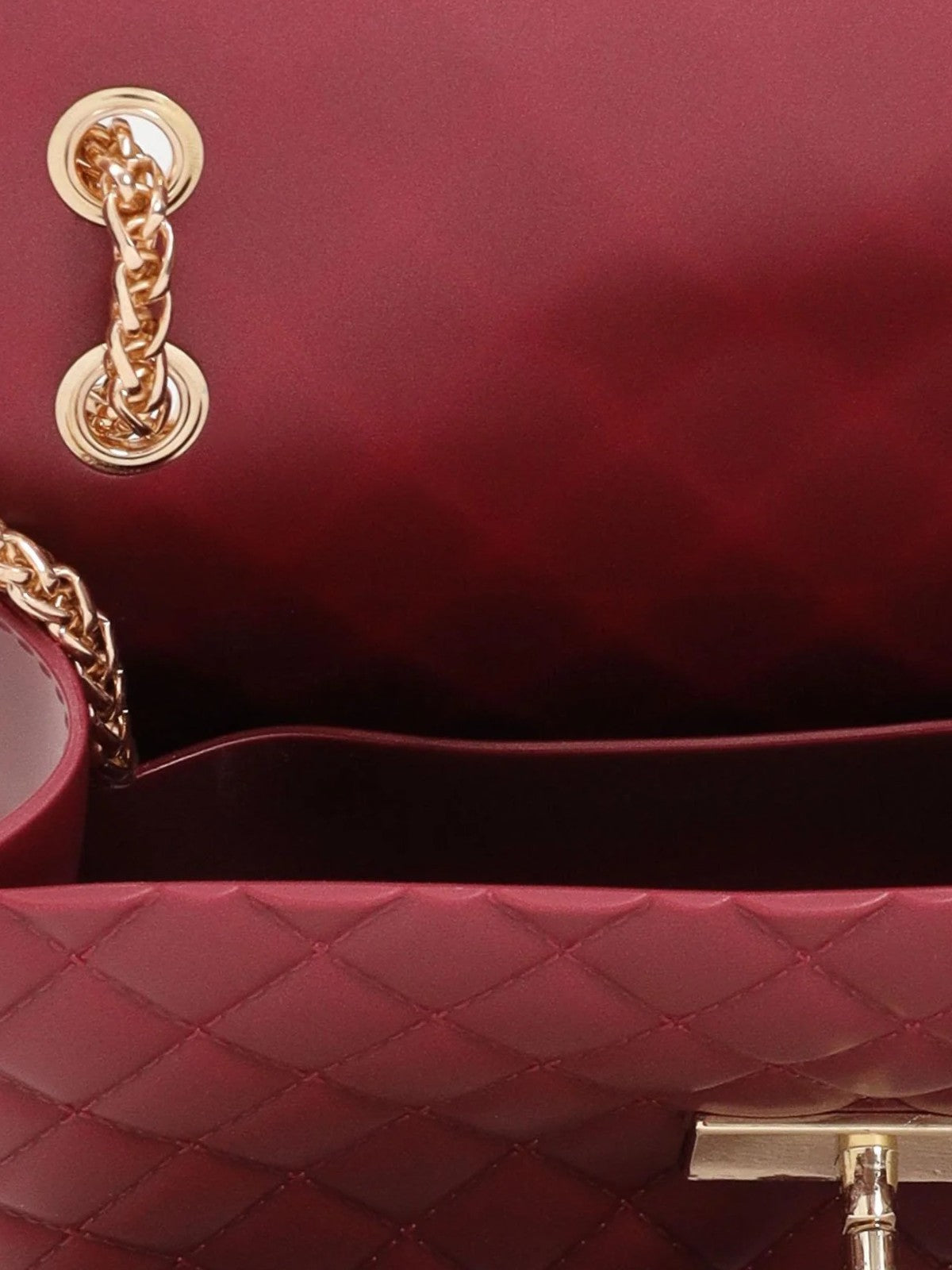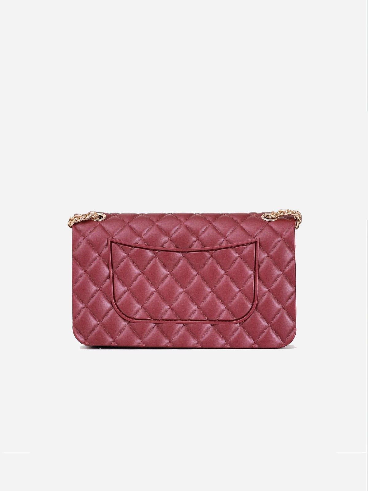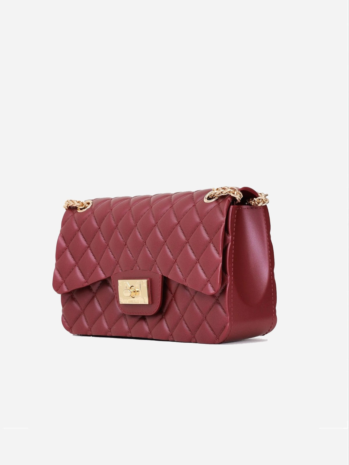 Realizzata in gomma trapuntata con lavorazione a rombi, sfoggia una silhouette compatta e raffinata, impreziosita da dettagli in metallo dorato. La patta frontale è arricchita dalla chiusura turn-lock con logo Marc Ellis inciso, che unisce funzionalità e carattere glam. La borsa è dotata di tracolla a catena dorata, regolabile per essere indossata sia a spalla che crossbody.