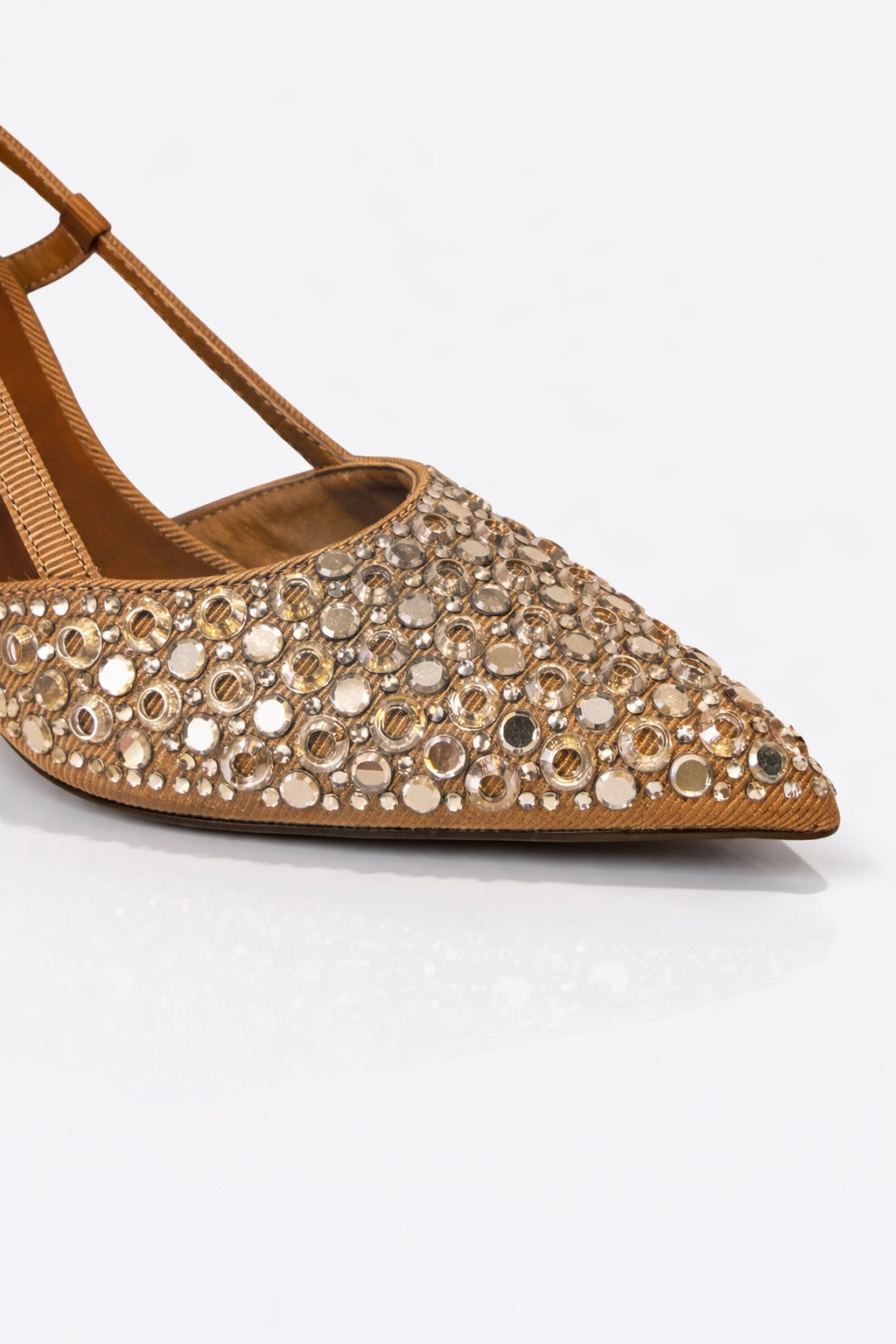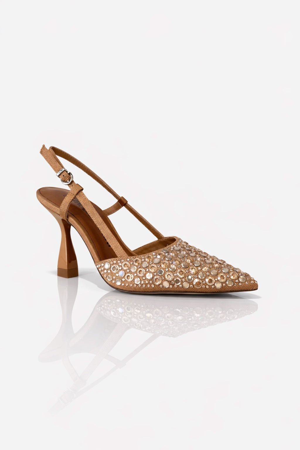 Lasciati sedurre dalla luce inconfondibile delle sling-back di Luciano Barachini. Un tripudio di cristalli all-over su tutta la tomaia. Tacco alto 8,5 cm leggermente svasato per una maggiore stabilità.