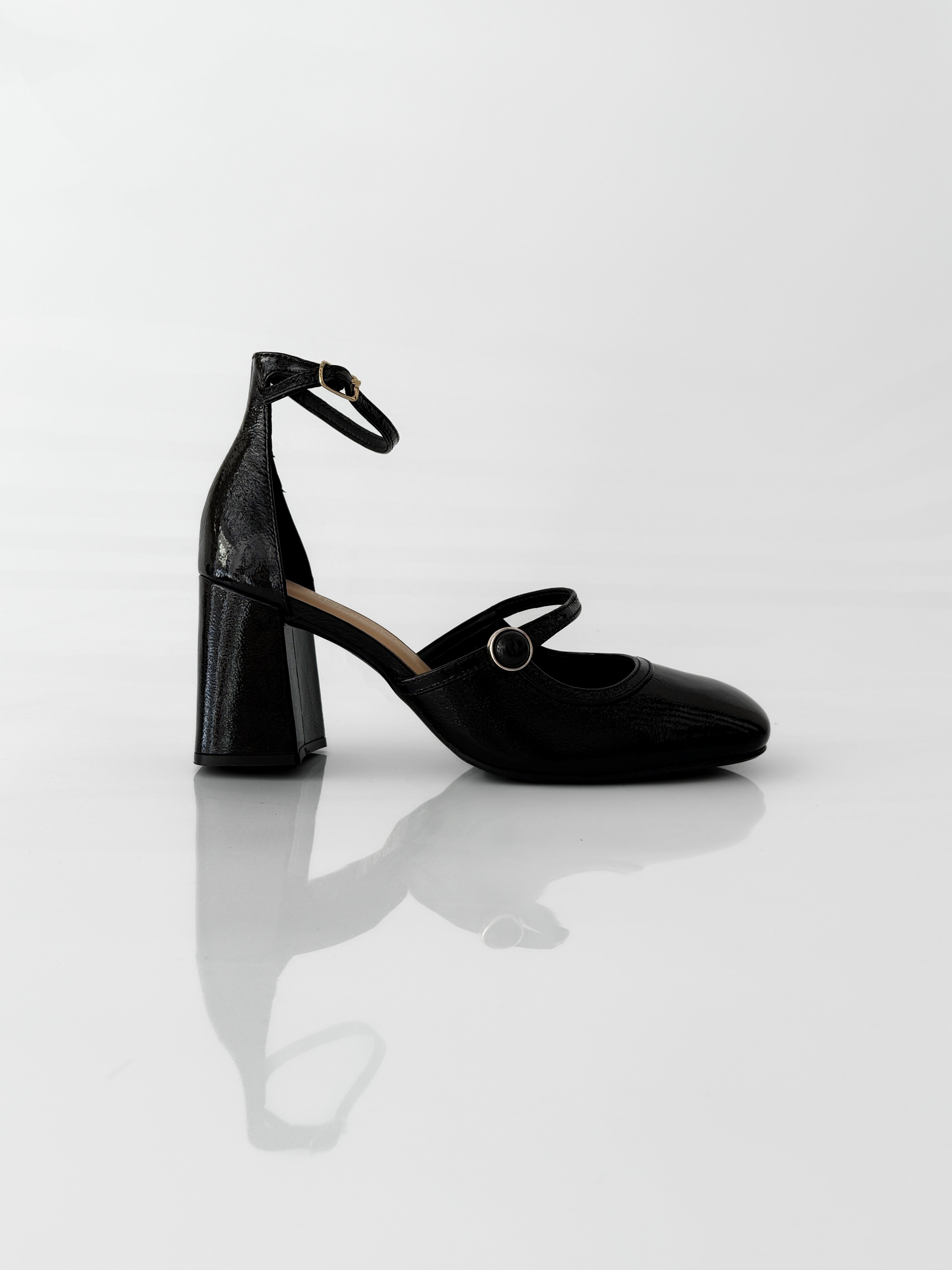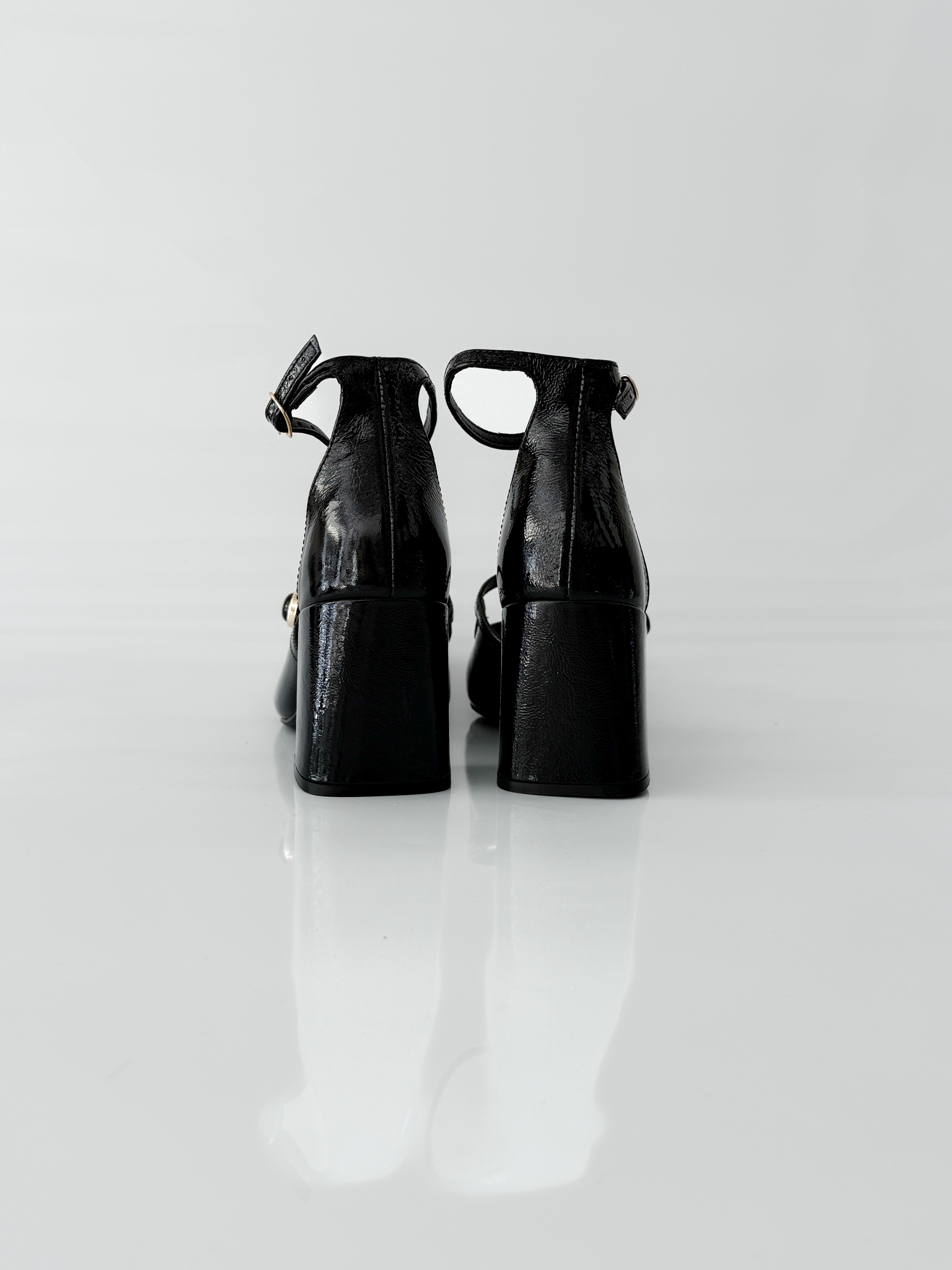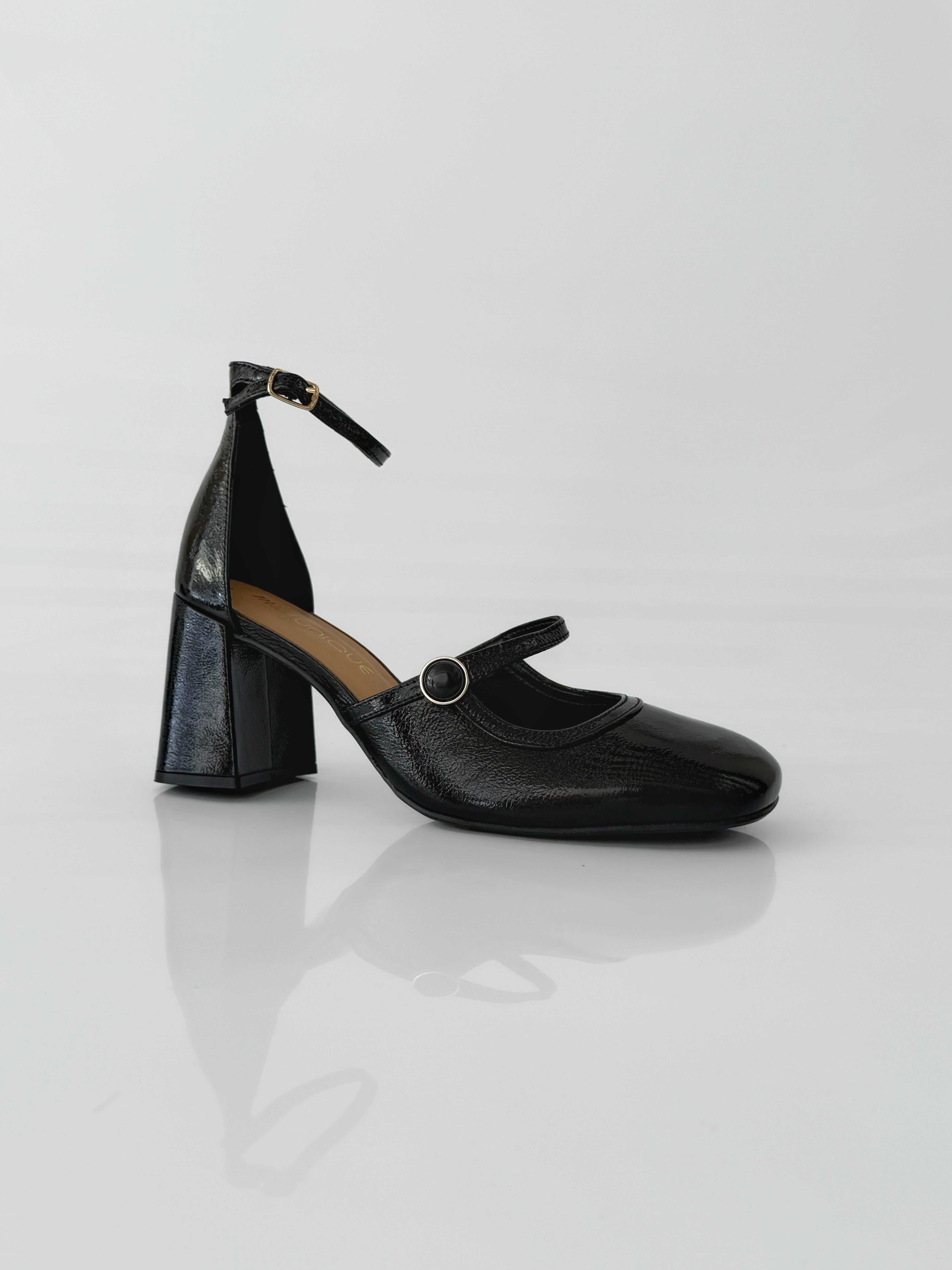 Queste mart-jane  aggiornano un classico intramontabile con un twist grintoso: realizzata interamente in pelle verniciata, la tomaia è arricchita da cinturini e bottone in tinta.